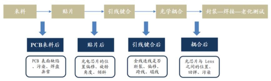 AOI 检测深度嵌入光模块制造四大核心环节。在光模块生产流程中, AOI 检测主要部署于PCB 来料后、贴片后、 引线键合后、耦合后四大节点,对应四台设备,分别对应检测基板缺陷、芯片贴装精度、金线连接可靠性及光 耦合效率等检测内容,为高端光模块的良率与性能提供关键保障。